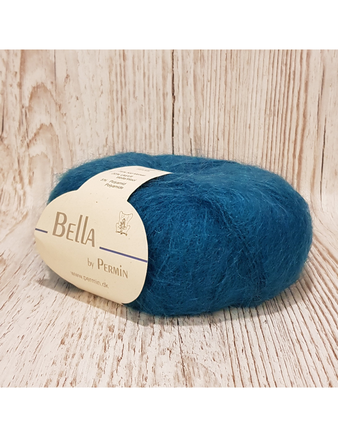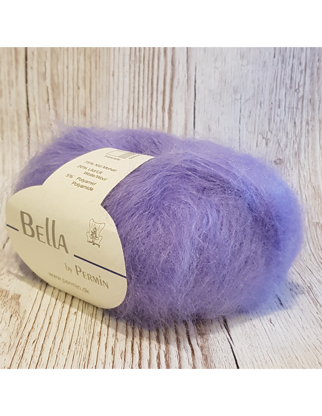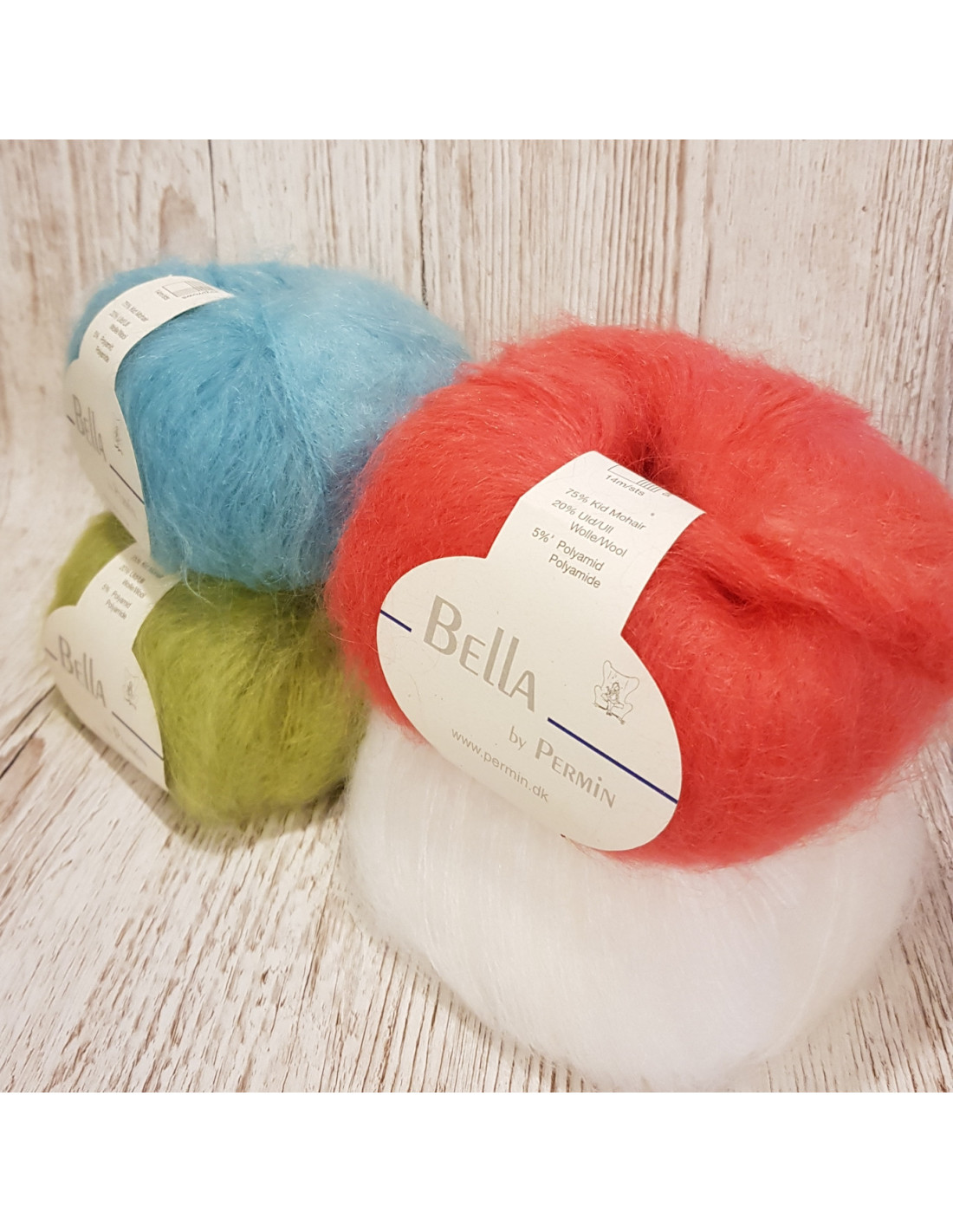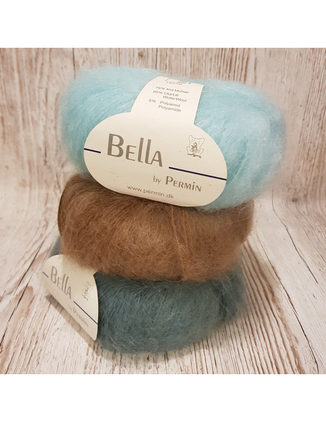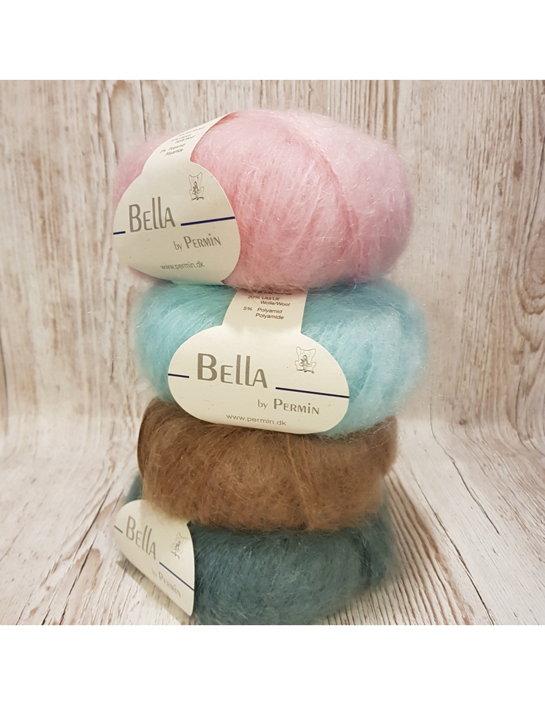 Bella från Permin är ett härligt mohair-garn av den mer klassiska sorten. I Bella stickar vi fluffiga och fina plagg som ger lite 80-talskänsla. Det finns mönster både i enkelt garn (stickor nr 6) eller dubbelt (stickor nr 10-12).