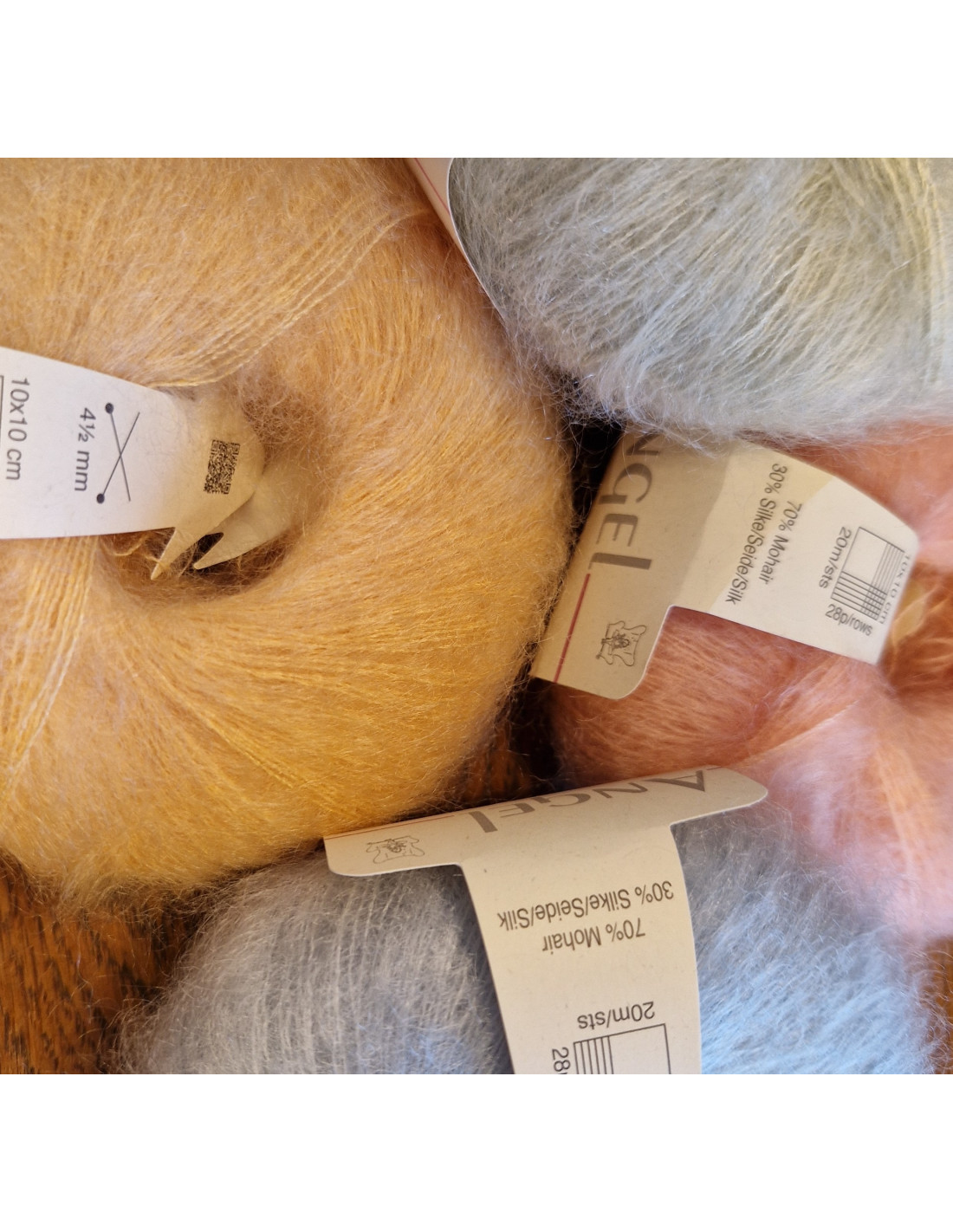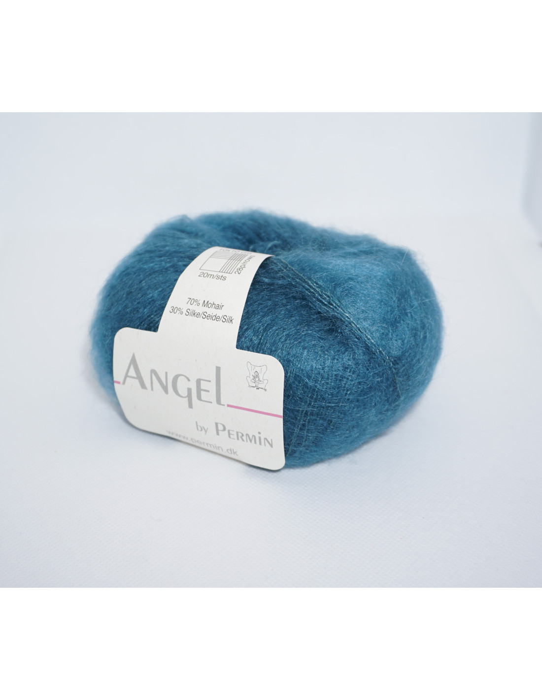 Angel från Permin är en av de allra mjukaste av tunna mohairer. Vi använder den som den är eller gärna tillsammans med ett annat garn. Passar egentligen till alla typer av projekt, såsom tröjor, sjalar, mössor... Variationerna blir oändliga eftersom det är så härligt tillsammans med andra garner.